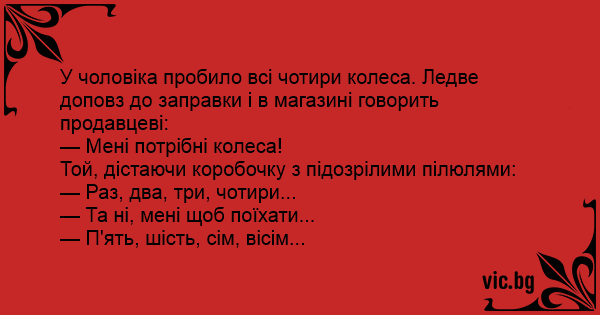 У чоловіка пробило всі чотири колеса. Ледве доповз до заправки і в магазині говорить продавцеві: