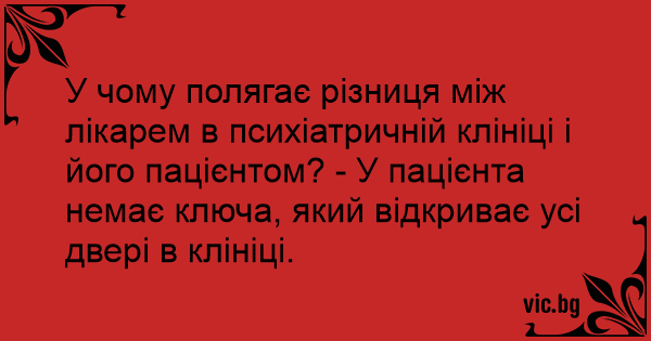 У чому полягає різниця між лікарем в психіатричній клініці і його пацієнтом? - У пацієнта немає ключа, який відкриває усі двері в клініці.