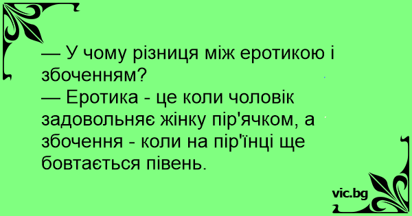 — Еротика - це коли чоловік задовольняє жінку пір'ячком, а збочення - коли на пір'їнці ще бовтається півень.