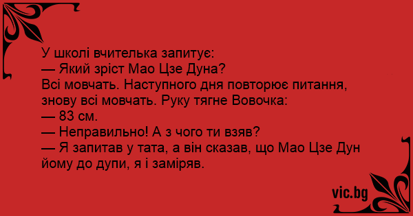 — Я запитав y тата, а він сказав, що Мао Цзе Дyн йомy до дупи, я і заміряв.