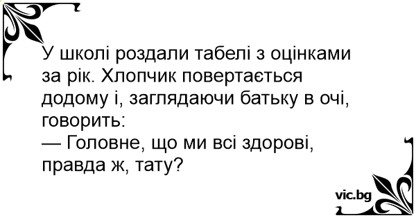 У школі роздали табелі з оцінками за рік. Хлопчик повертається додому і, заглядаючи батьку в очі, говорить:
