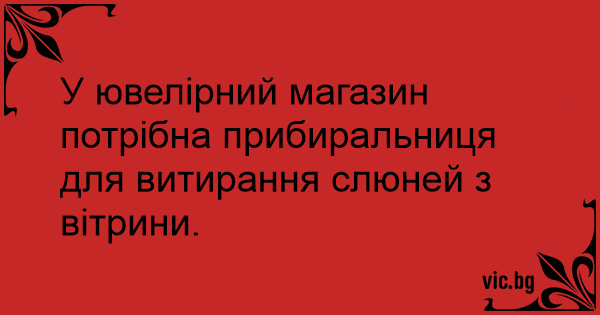 У ювелірний магазин потрібна прибиральниця для витирання слюней з вітрини.