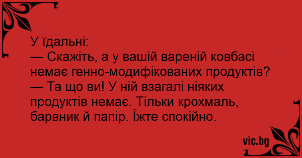 — Скажіть, а у вашій вареній ковбасі немає генно-модифікованих продуктів?