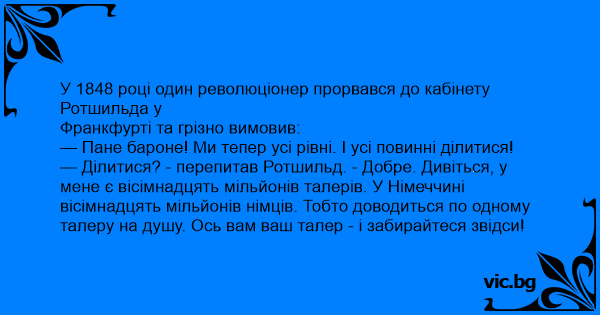 — Ділитися? - перепитав Ротшильд. - Добре. Дивіться, у мене є вісімнадцять мільйонів талерів. У Німеччині вісімнадцять мільйонів німців. Тобто доводиться по одному талеру на душу. Ось вам ваш талер - і забирайтеся звідси!