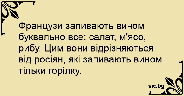 Французи запивають вином буквально все: салат, м'ясо, рибу. Цим вони відрізняються від росіян, які запивають вином тільки горілку.