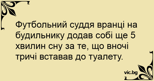 Футбольний суддя вранці на будильнику додав собі ще 5 хвилин сну за те, що вночі тричі вставав до туалету.
