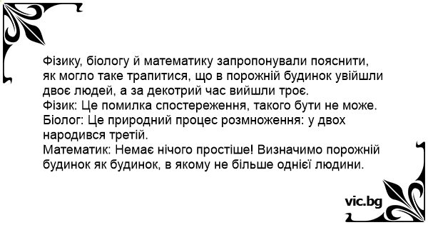 Фізику, біологу й математику запропонували пояснити, як могло таке трапитися, що в порожній будинок увійшли двоє людей, а за декотрий час вийшли троє.