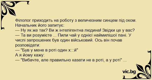 Філолог приходить на роботу з величезним синцем під оком. Начальник його запитує:
