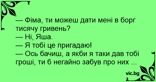— Фіма, ти можеш дати мені в борг тисячу гривень?<br />— Ні, Яша.<br />— Я тобі це пригадаю!<br />— Ось бачиш, а якби я таки дав тобі гроші, ти б негайно забув про них ...