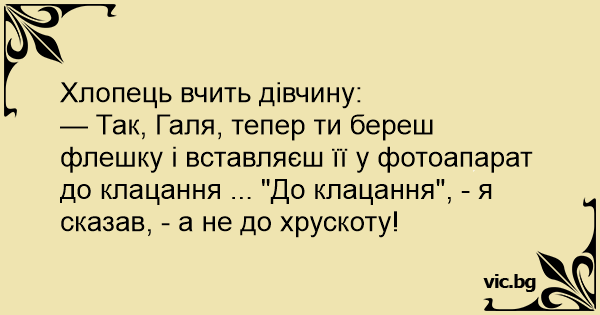 — Так, Галя, тепер ти береш флешку і вставляєш її у фотоапарат до клацання ... "До клацання", - я сказав, - а не до хрускоту!