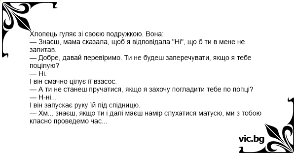 — Хм... знаєш, якщо ти і далі маєш намір слухатися матусю, ми з тобою класно проведемо час...