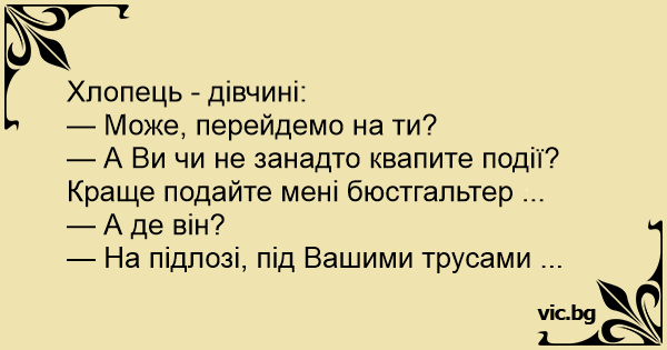 — А Ви чи не занадто квапите події? Краще подайте мені бюстгальтер ...