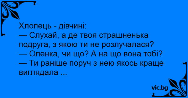 — Слухай, а де твоя страшненька подруга, з якою ти не розлучалася?