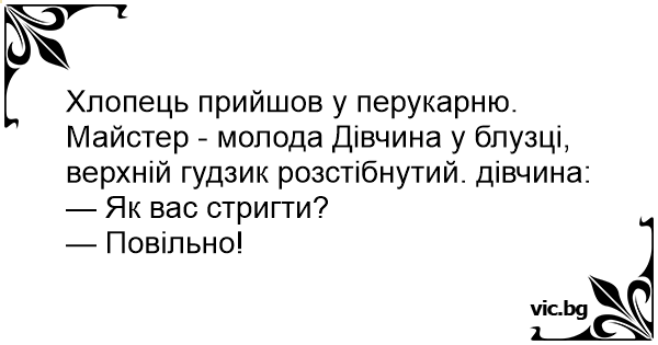 Хлопець прийшов у перукарню. Майстер - молода Дівчина у блузці, верхній гудзик розстібнутий. дівчина:
