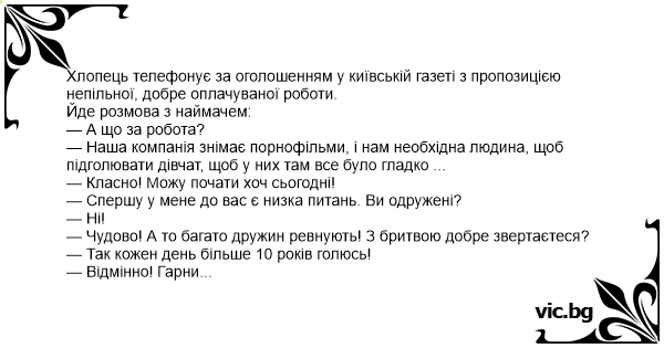 — Наша компанія знімає порнофільми, і нам необхідна людина, щоб підголювати дівчат, щоб у них там все було гладко ...