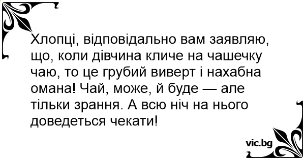 Хлопці, відповідально вам заявляю, що, коли дівчина кличе на чашечку чаю, то це грубий виверт і нахабна омана! Чай, може, й буде — але тільки зрання. А всю ніч на нього доведеться чекати!