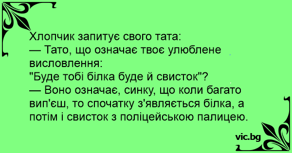 — Воно означає, синку, що коли багато вип'єш, то спочатку з'являється білка, а потім і свисток з поліцейською палицею.