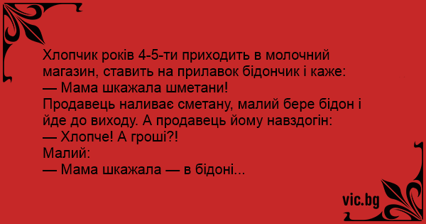 Продавець наливає сметану, малий бере бідон і йде до виходу. А продавець йому навздогін: