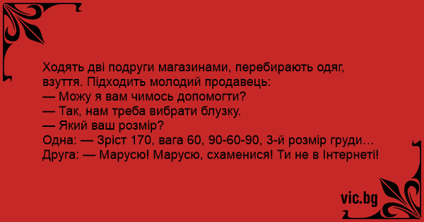 Ходять дві подруги магазинами, перебирають одяг, взуття. Підходить молодий продавець: