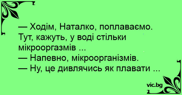 — Ходім, Наталко, поплаваємо. Тут, кажуть, у воді стільки мікрооргазмів ...