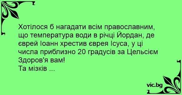Хотілося б нагадати всім православним, що температура води в річці Йордан, де єврей Іоанн хрестив єврея Ісуса, у ці числа приблизно 20 градусів за Цельсієм