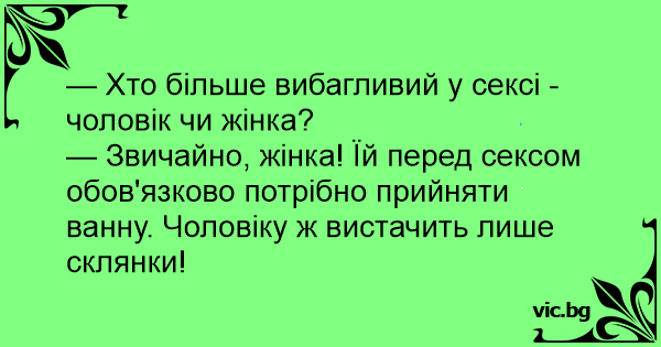 — Звичайно, жінка! Їй перед сексом обов'язково потрібно прийняти ванну. Чоловіку ж вистачить лише склянки!