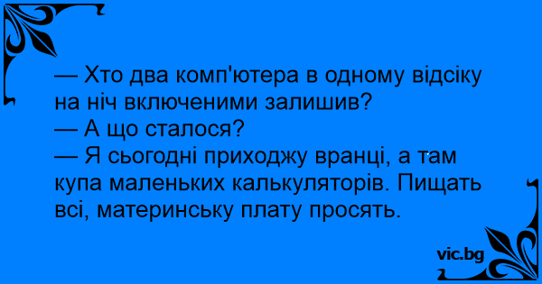 — Я сьогодні приходжу вранці, а там купа маленьких калькуляторів. Пищать всі, материнську плату просять.