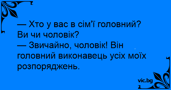 — Хто у вас в сім'ї головний? Ви чи чоловік? — Звичайно, чоловік! Він головний виконавець усіх моїх розпоряджень.