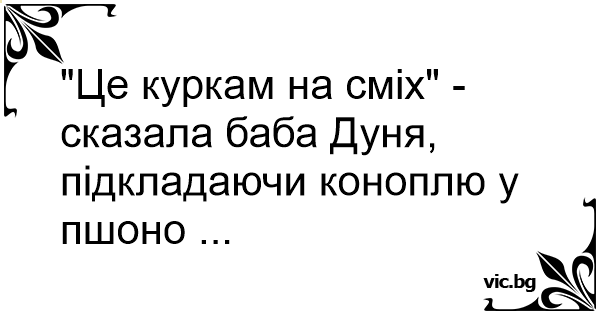 "Це куркам на сміх" - сказала баба Дуня, підкладаючи коноплю у пшоно ...