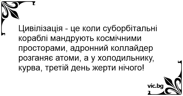 Цивілізація - це коли суборбітальні кораблі мандрують космічними просторами, адронний коллайдер розганяє атоми, а у холодильнику, kуpba, третій день жерти нічого!