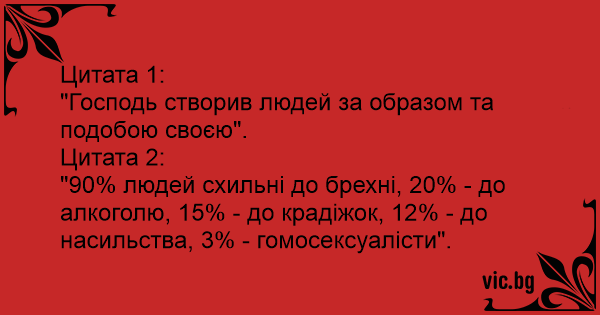 "90% людей схильні до брехні, 20% - до алкоголю, 15% - до крадіжок, 12% - до насильства, 3% - гомосексуалісти".