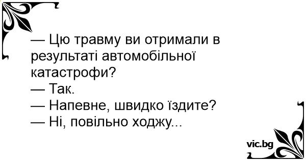 - Šī trauma ir autoavārijas rezultāts? - Jā,dakter. - Laikam jūs ļoti ātri braucat? - Nē,ļoti lēni eju.