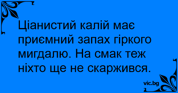Ціанистий калій має приємний запах гіркого мигдалю. На смак теж ніхто ще не скаржився.