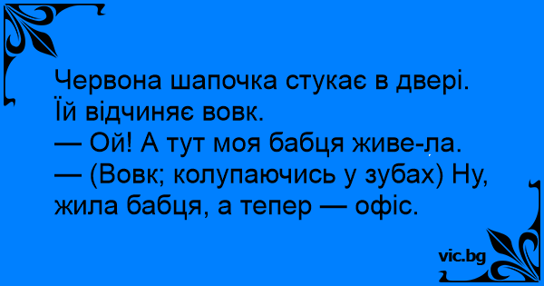 — (Вовк; колупаючись у зубах) Ну, жила бабця, а тепер — офіс.