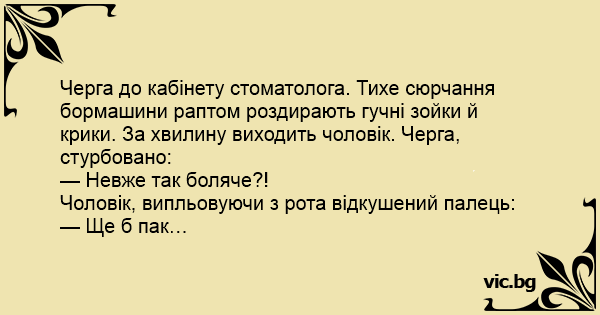 Черга до кабінету стоматолога. Тихе сюрчання бормашини раптом роздирають гучні зойки й крики. За хвилину виходить чоловік. Черга, стурбовано: