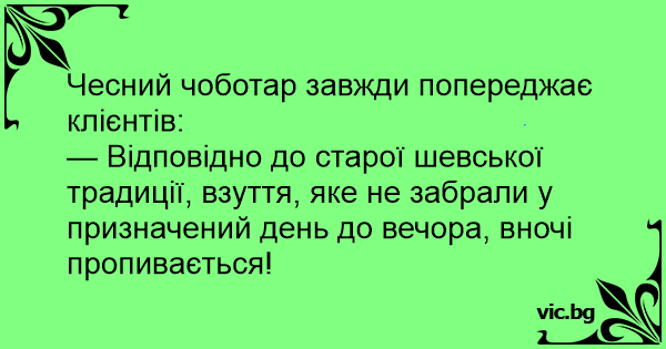 — Відповідно до старої шевської традиції, взуття, яке не забрали у призначений день до вечора, вночі пропивається!