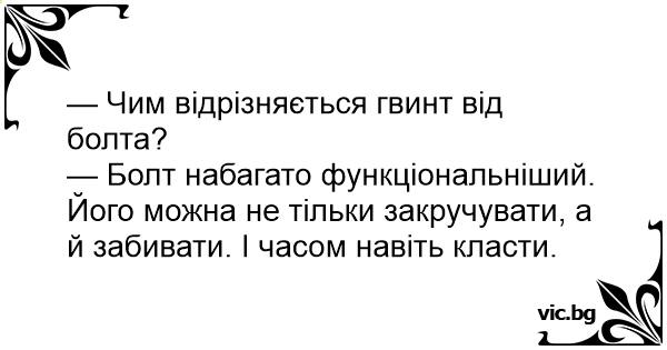— Болт набагато функціональніший. Його можна не тільки закручувати, а й забивати. І часом навіть класти.