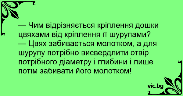 — Цвях забивається молотком, а для шурупу потрібно висвердлити отвір потрібного діаметру і глибини і лише потім забивати його молотком!