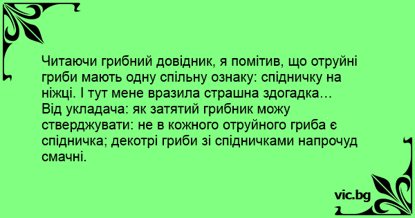 Читаючи грибний довідник, я помітив, що отруйні гриби мають одну спільну ознаку: спідничку на ніжці. І тут мене вразила страшна здогадка…