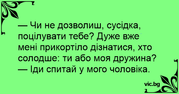 — Чи не дозволиш, сусідка, поцілувати тебе? Дуже вже мені прикортіло дізнатися, хто солодше: ти або моя дружина?