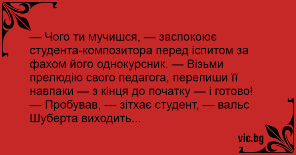— Чого ти мучишся, — заспокоює студента-композитора перед іспитом за фахом його однокурсник. — Візьми прелюдію свого педагога, перепиши її навпаки — з кінця до початку — і готово!