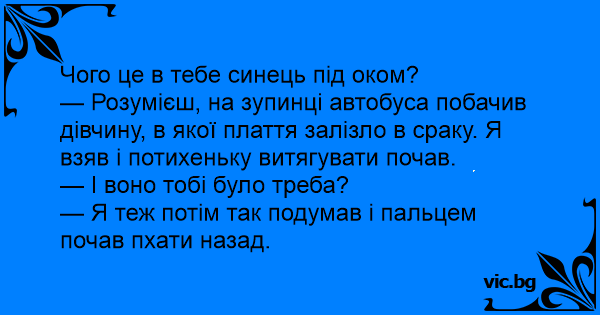 — Розумієш, на зупинці автобуса побачив дівчину, в якої плаття залізло в сраку. Я взяв і потихеньку витягувати почав.
