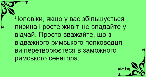 Чоловіки, якщо у вас збільшується лисина і росте живіт, не впадайте у відчай. Просто вважайте, що з відважного римського полководця ви перетворюєтеся в заможного римського сенатора.