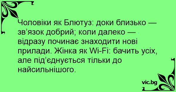 Чоловіки як Блютуз: доки близько — зв’язок добрий; коли далеко — відразу починає знаходити нові прилади. Жінка як Wi-Fi: бачить усіх, але під’єднується тільки до найсильнішого.