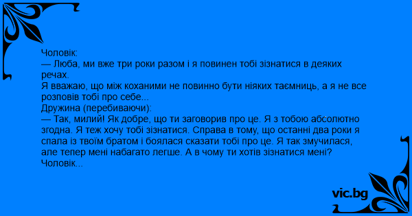 — Так, милий! Як добре, що ти заговорив про це. Я з тобою абсолютно згодна. Я теж хочу тобі зізнатися. Справа в тому, що останні два роки я спала із твоїм братом і боялася сказати тобі про це. Я так змучилася, але тепер мені набагато легше. А в чому ти хотів зізнатися мені?