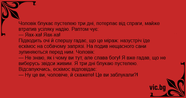 Чоловік блукає пустелею три дні, потерпає від спраги, майже втратив усіляку надію. Раптом чує: