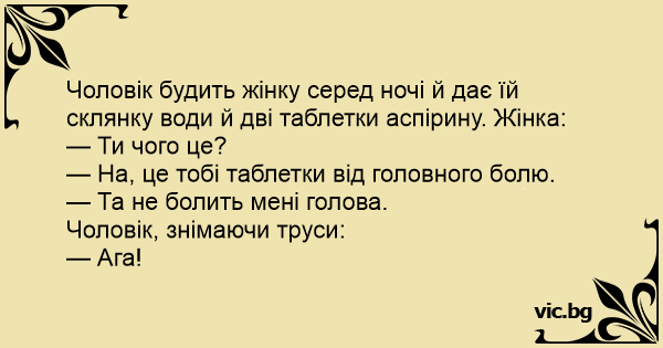 Чоловік будить жінку серед ночі й дає їй склянку води й дві таблетки аспірину. Жінка: