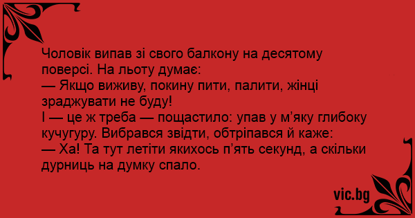 Чоловік випав зі свого балкону на десятому поверсі. На льоту думає: