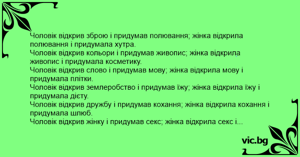 Чоловік відкрив жінку і придумав cekc; жінка відкрила cekc і придумала головний біль.