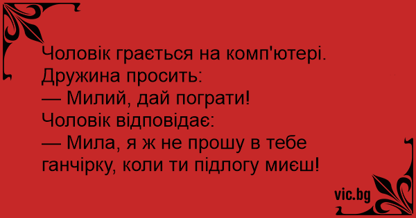 — Мила, я ж не прошу в тебе ганчірку, коли ти підлогу миєш!